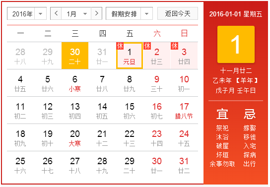 1元旦:1月1日放假,與周末連休。注意假期安全措施。