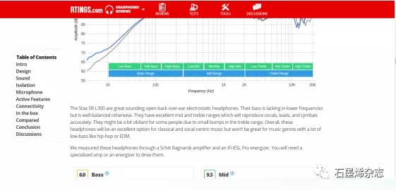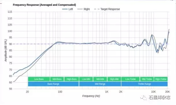 國外名牌頻響檢測(cè)圖顯示普通靜電耳機(jī)最大的問題就是低頻段滾落太大,導(dǎo)致在100hz以下的低頻會(huì)有一種量感上的的缺失,網(wǎng)站在下面的一段話也說明了這一點(diǎn)。這也是靜電耳機(jī)很難解決的一個(gè)問題。不過好在我們用的石墨烯振膜在測(cè)試中幾乎完美的克服了低頻段的問題,這說明了石墨烯靜電耳機(jī)的優(yōu)勢(shì)。