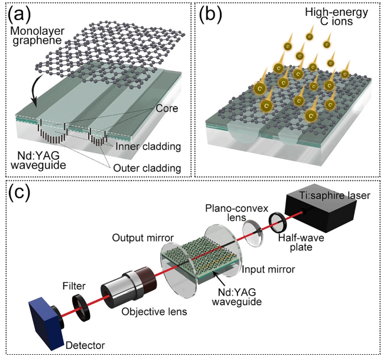 圖1. (a)單層石墨烯轉(zhuǎn)移到Nd:YAG通道波導(dǎo)表面的示意圖。(b)用高能碳離子對(duì)波導(dǎo)上的單層石墨烯進(jìn)行離子輻照的示意圖。(c)通過倏逝場(chǎng)相互作用的無源Q開關(guān)波導(dǎo)激光器實(shí)驗(yàn)裝置示意圖。