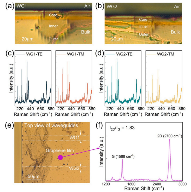 圖2. Nd:YAG 晶體中兩個(gè)通道波導(dǎo)的光學(xué)端面圖像:(a) WG1 和 (b) WG2。從平面波導(dǎo)層收集的拉曼光譜:(c) WG1 和 (d) WG2。(e) Nd:YAG 波導(dǎo)表面單層石墨烯的光學(xué)成像。(f) 在單層石墨烯上的粉色點(diǎn)處測(cè)量的拉曼光譜。