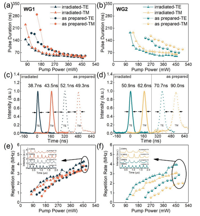 圖4. WG1 和 WG2 中輻照石墨烯和制備好的石墨烯進(jìn)行 Q 開關(guān)脈沖波導(dǎo)激光器比較:(a) 和 (b) 脈沖持續(xù)時(shí)間,(c) 和 (d) 最短脈沖持續(xù)時(shí)間,(e) 和 (f) 重復(fù)率。