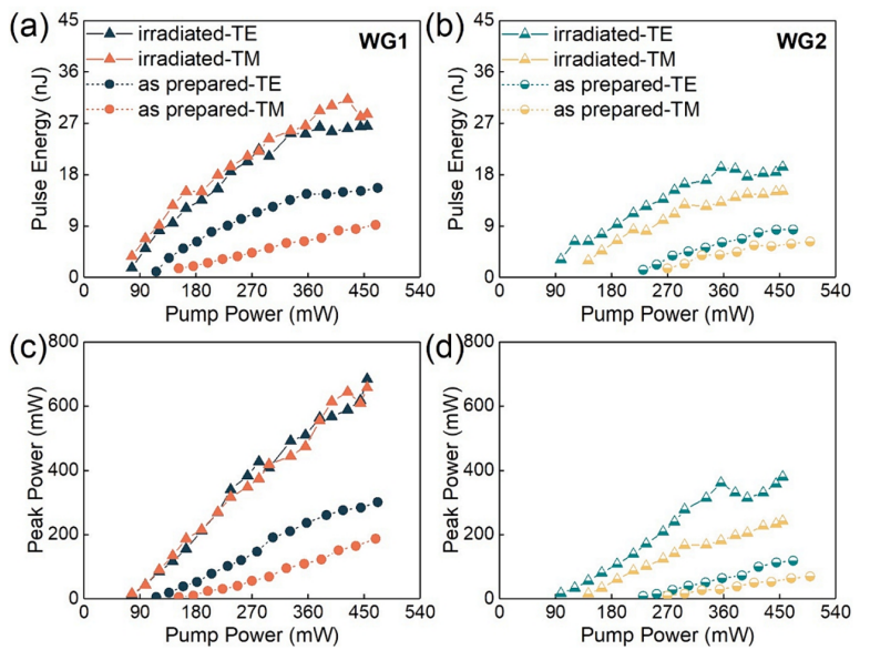 圖5. WG1 和 WG2 中輻照石墨烯和制備好的石墨烯進(jìn)行 Q 開關(guān)脈沖波導(dǎo)激光比較:(a) 和 (b) 脈沖能量,(c) 和 (d) 峰值功率。