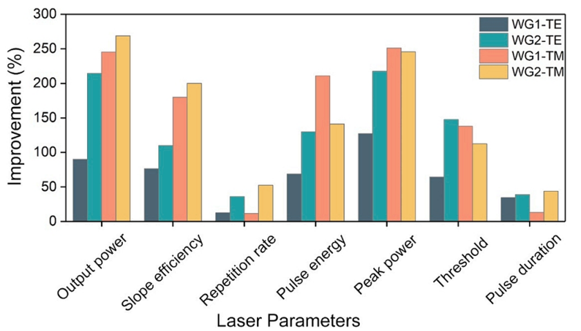 圖6. 離子輻照后無源Q開關(guān)波導(dǎo)激光器參數(shù)的提高。