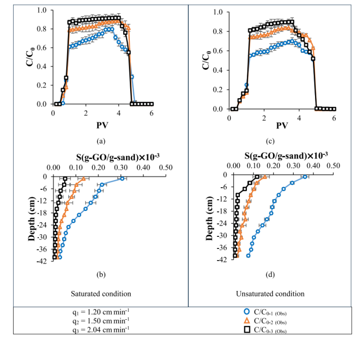 納米材料的廣泛使用增加了納米顆粒 (NPs) 感染土壤和地下水資源的威脅。本研究旨在研究流速、離子強(qiáng)度 (IS) 和初始顆粒濃度三個(gè)參數(shù)對(duì)聚乙烯吡咯烷酮功能化氧化石墨烯 (GO-PVP) 傳輸行為和保留機(jī)制的影響。在實(shí)驗(yàn)室規(guī)模的研究中研究了 GO-PVP 通過飽和/不飽和(飽和度 = 0.91)沙柱的傳輸。實(shí)驗(yàn)在流速為 1.20 至 2.04 cm min