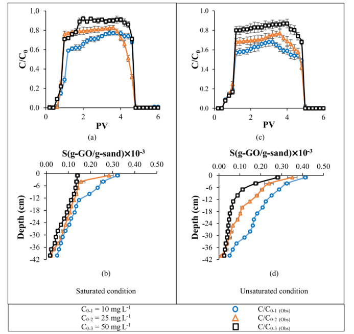 -1 和 IS 為 5-20 mM 的條件下進(jìn)行。使用 HYDRUS-1D 中的單點(diǎn)動(dòng)力學(xué)附著模型可以最好地描述 GO-PVP 的保留,該模型考慮了時(shí)間和深度相關(guān)性的保留。根據(jù)突破曲線 (BTCs),通過降低流速和初始顆粒濃度并增加通過沙柱的 IS,獲得了與 GO-PVP 質(zhì)量恢復(fù)速率相關(guān)的較低傳輸率。增加 IS 可以提高飽和/不飽和介質(zhì)中的 GO-PVP 保留率(基于 k