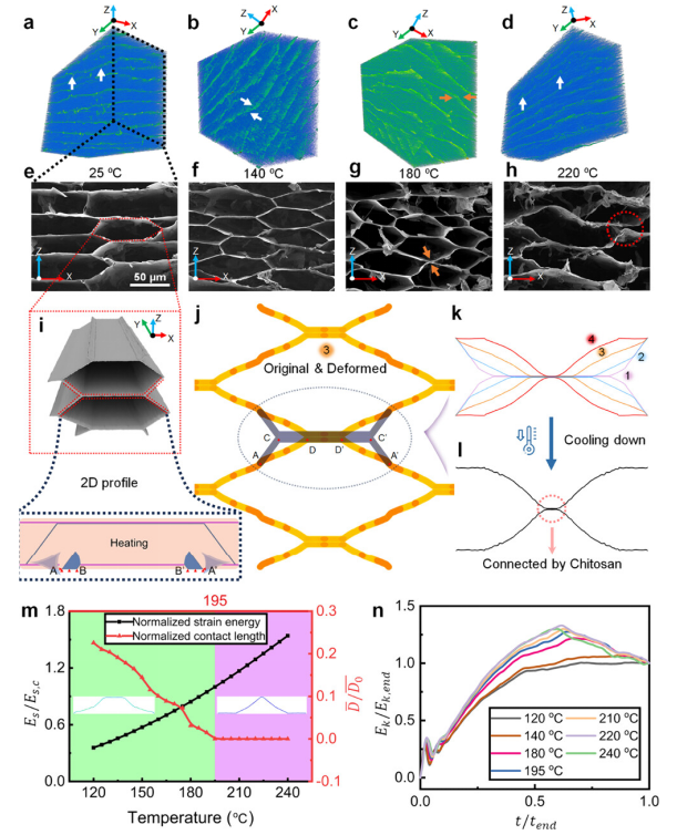 Fig 2. 橫截面中平面微觀結(jié)構(gòu)轉(zhuǎn)變的力學(xué)。(a–d)顯微CT圖像和(e–h)退火溫度分別為25、140、180和220°C的微觀結(jié)構(gòu)SEM圖像。(i) 3D插圖和2D FEA模型。(j) t/t0=0.9時初始(灰色)和重構(gòu)(黃色)微觀結(jié)構(gòu)的比較。(k) 半蜂窩結(jié)構(gòu)在不同時間跨度下的熱屈曲模擬結(jié)果。標(biāo)簽1-4分別表示t/t0值為0.3、0.6、0.9和1時的狀態(tài)。(l) 加熱后冷卻的模擬結(jié)果。(m) 屈曲蜂窩結(jié)構(gòu)(綠色)和屈曲結(jié)構(gòu)(紫色)隨溫度變化的相圖。(n) 歸一化動能Ek/Ek的演變在不同溫度下以時間比t/trend結(jié)束。