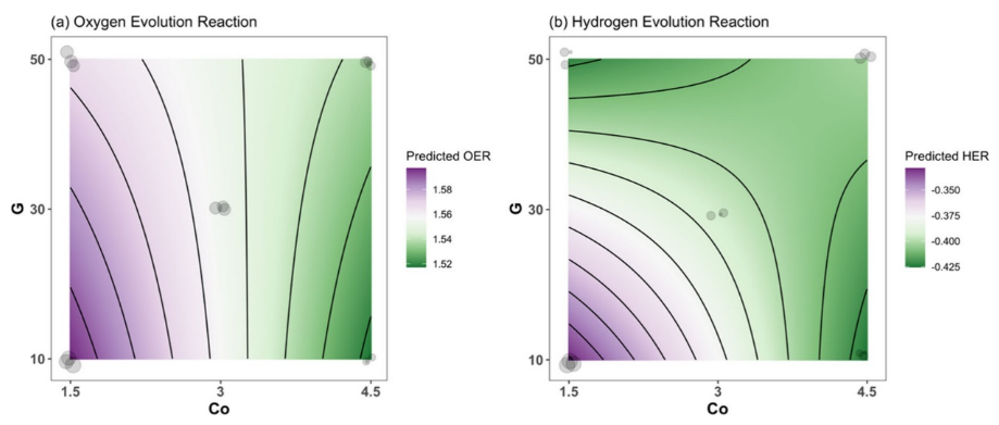 圖2. (a) Co和g的二維梯度上的預測OER和(b) HER。觀測值以灰色點的形式顯示,其大小與觀測值成正比。點被輕微抖動以方便可視化。
