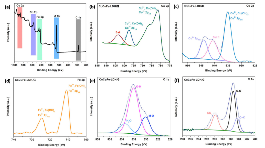 [10]的XPS:(a)測量,(b) Co 2p, (c) Cu 2p, (d) Fe 2p, (e) O 1s, (f) C 1s。