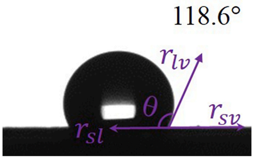 圖3. LIG 膜與水的表面接觸角測(cè)量。(LIG 膜上的一滴液體呈現(xiàn)三邊界相)。