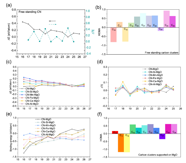 n (n = 16-26)在X摻雜MgO (X = Si, Mn, Fe, Ca, Al)上的結(jié)合能。(f) Cn@MgO的HOMA指數(shù)值(n = 16-26)。使用預(yù)訓(xùn)練的ML-FF進(jìn)行靜態(tài)優(yōu)化。