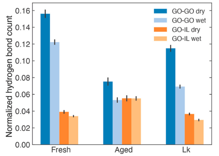 圖10.比較干(深色)和濕(淺色)界面之間每個氧化石墨烯堆疊中按氧計數(shù)歸一化的平均氫鍵數(shù)。不確定度條表示離平均值一個標準差。