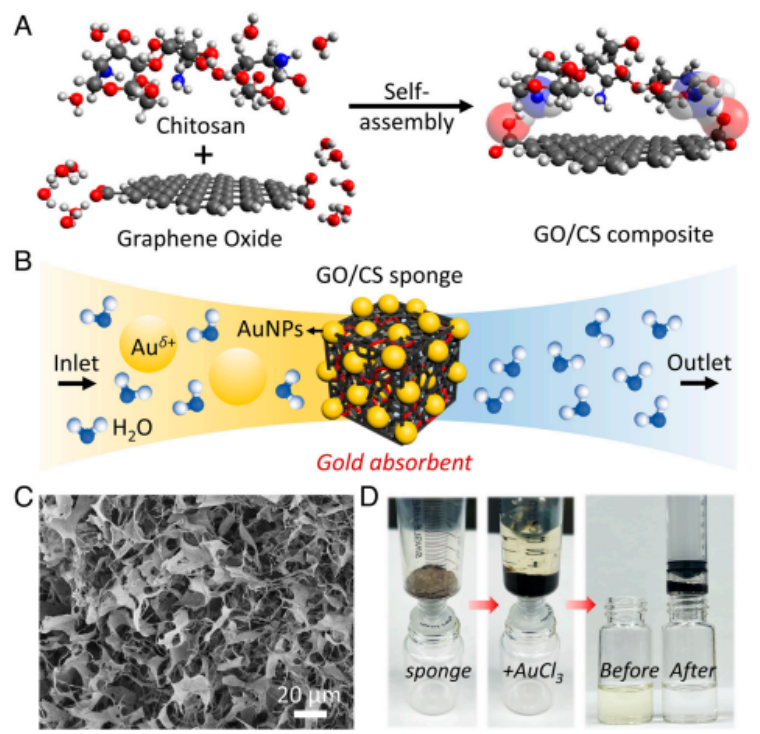 圖 1. GO/殼聚糖海綿用于金的吸附和過濾。(A)通過密度泛函理論計算優(yōu)化的 CS⋅⋅⋅GO 復(fù)合物的幾何形狀。(B)用于超快速高效吸附/提取金的 GO/CS 海綿示意圖,δ = 1 或 3。(C)GO/CS5 海綿的 SEM 圖像。(D)照片顯示了裝入注射器的 GO/CS 海綿(左),然后加入 5 mL 200 ppm Au3+ 溶液(中)以及過濾前后實時顏色變化的可視化(右)。2.5 mg 海綿吸附劑以 0.14 g/g min 的吸附速率(詳見 SI 附錄表 S1)從 5 mL 中提取 200 ppm 的金需要大約 2.86 分鐘。