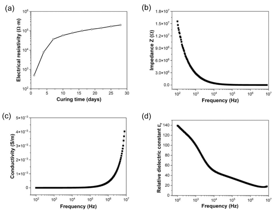 圖 4. 石墨烯-水泥復(fù)合材料的電學(xué)和介電性能:(a)直流固化過程中的電阻率發(fā)展;(b)水泥基板的阻抗;(c)水泥基板的電導(dǎo)率;(d)隨頻率變化的相對介電常數(shù)。