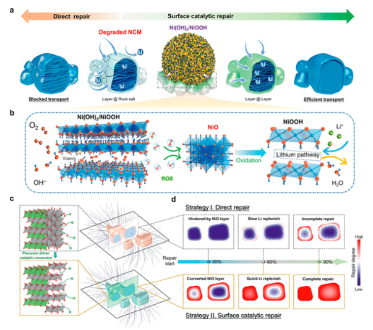 -和釋放ROS的過程示意圖。(c)巖鹽NiO轉(zhuǎn)化前后鋰離子輸運(yùn)路徑由封閉到開放的變化過程示意圖。(d)兩種不同修復(fù)方法的鋰補(bǔ)給過程有限元模擬。