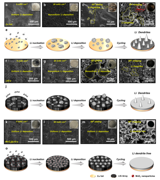 -2 下剝離。(o) MnOx@LIG-a 電極上鍍鋰行為的示意圖(嵌圖是相應(yīng)的光學(xué)圖像)。