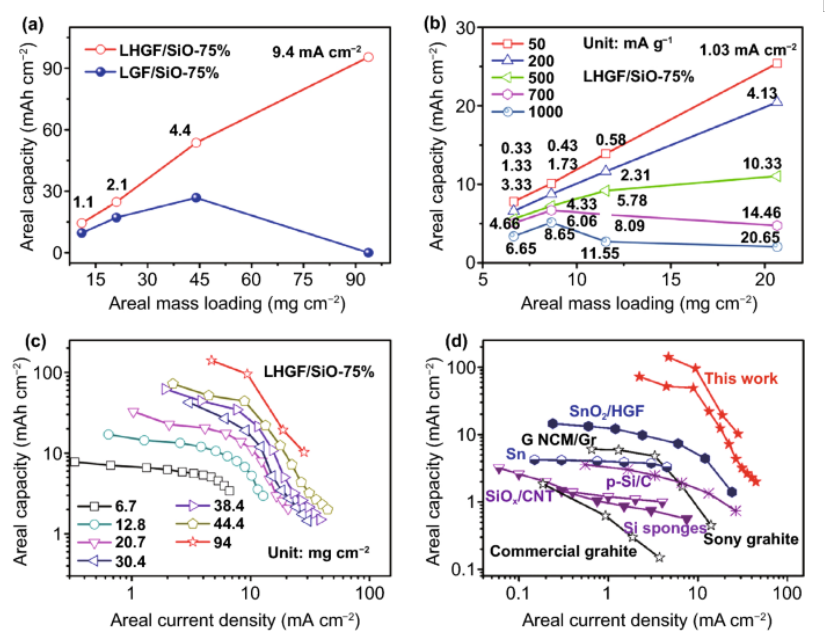 Fig 4. (a) LHGF/SiO-75%和LGF/SiO-75%電極在100 mA g?¹時的面積容量與質量負荷的關系;(b) LHGF/SiO-75%電極在不同電流密度下的面積容量與質量負載的關系;(c) LHGF/SiO-75%電極在不同質量負載下的面積容量與電流密度的關系;(d) LHGF/SiO-75%電極與不同類型合金型負極的面容量性能對比。
