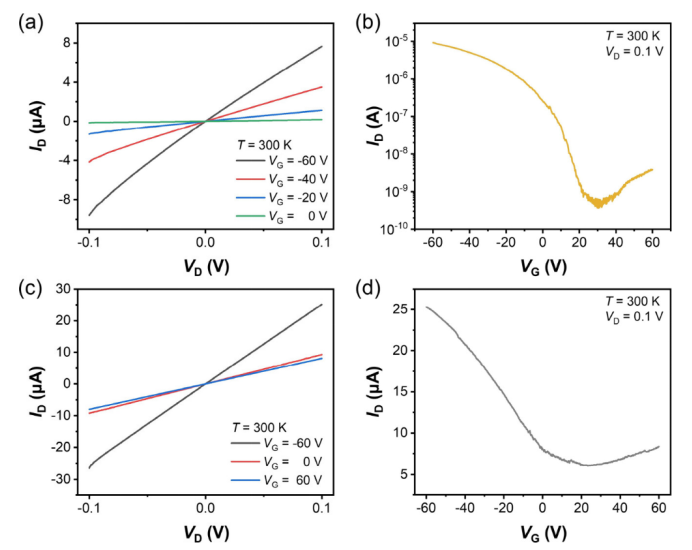 圖2. BP和Gr的電學(xué)特性。(a) 300 K時BP在0 ~−60 V范圍內(nèi)的輸出特性(b) VD = 0.1 V時BP的傳遞特性(c)−60 ~ +60 V范圍內(nèi)不同VG時Gr的輸出特性(d) VD = 0.1 V時Gr的傳遞特性。