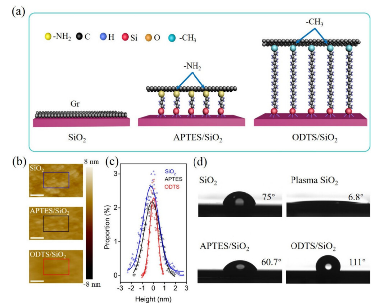 2襯底的AFM圖像;比例尺為1μm。(c) (b)中樣品表面的高度直方圖。(d) 原始SiO2、APTES/SiO
