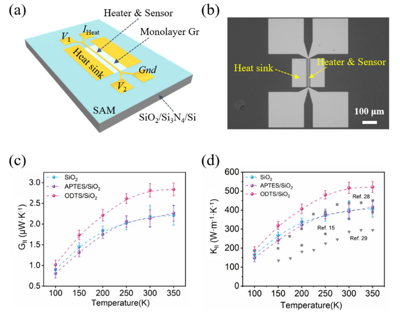 圖2. (a) 石墨烯在不同改性層上的熱導(dǎo)率測(cè)量。(a、b)懸掛式電熱測(cè)溫平臺(tái)示意圖(a)和掃描電鏡圖像(b)。(c) 原始SiO