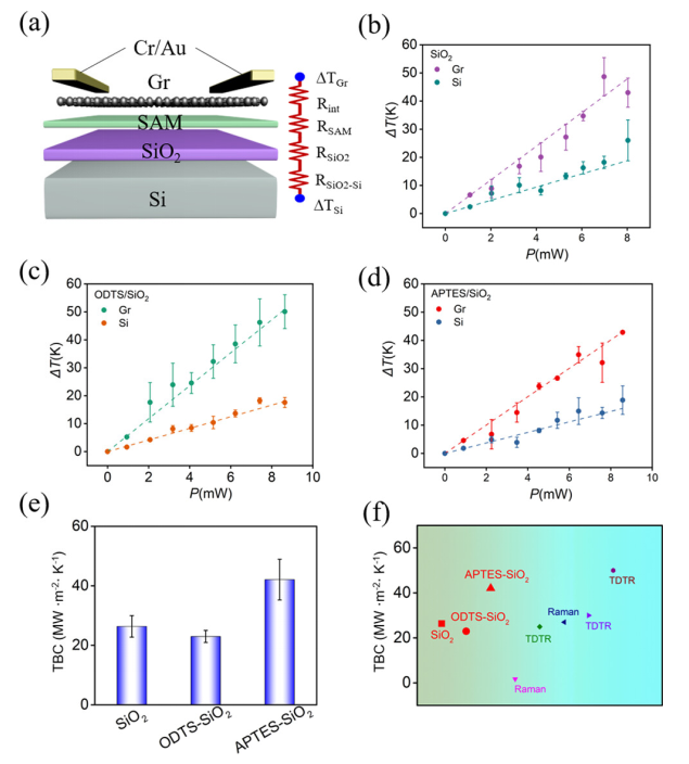 2(d)上的ΔTGr和ΔTSi與P的關(guān)系。(e) 石墨烯在不同基底上的TBC。(f) 與其他報(bào)道的石墨烯和SiO