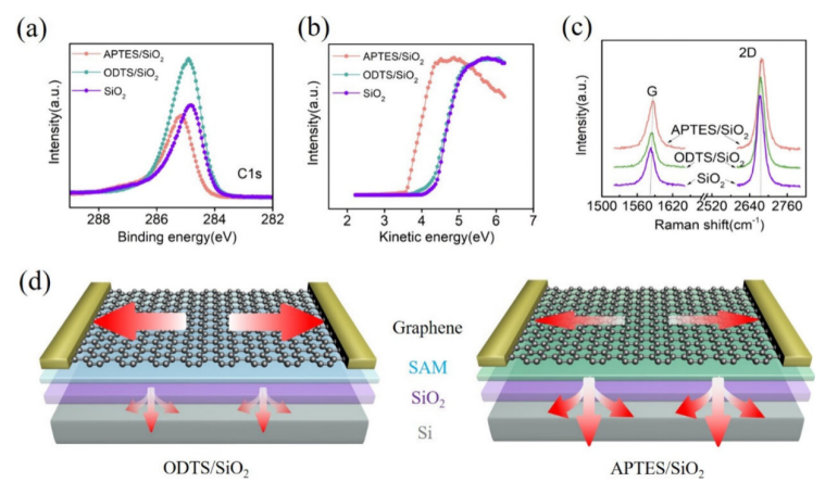 2上的拉曼光譜,石墨烯的特征G峰和2D峰。(d) ODTS(左)和APTES(右)石墨烯器件的散熱示意圖。