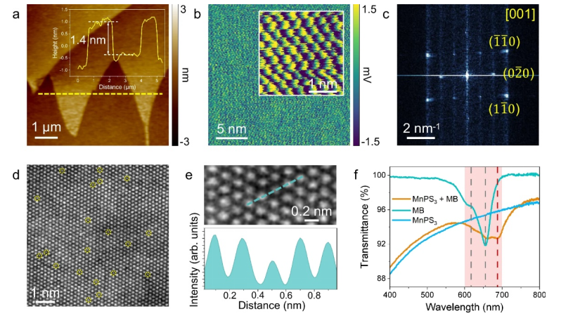 3的原子分辨HAADF-STEM圖像。表面空缺用黃色虛線圈表示。e(上)二維MnPS