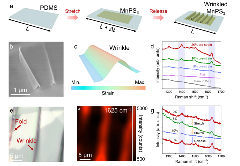 3中平行皺紋的制作原理圖。b皺紋的SEM圖像。c折皺中應(yīng)變變化示意圖。
