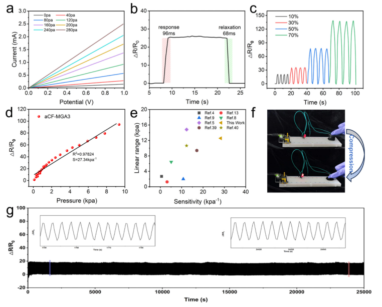 圖5. aCF-MGA3應(yīng)變壓力傳感。(a)不同應(yīng)力下aCF-MGA3的I-V曲線。(b)傳感器的響應(yīng)和恢復(fù)時間。(c)不同壓力下aCF-MGA3氣凝膠的相對阻力變化。(d) aCF-MGA3氣凝膠在(0-10 kpa)范圍內(nèi)相對電阻響應(yīng)的靈敏度。(e) aCF-MGA傳感器與其他報(bào)告的傳感器之間的靈敏度和壓力值比較圖。(f) aCF-MGA3對LED亮度的壓縮和解壓;(g)傳感器在30%應(yīng)變下10,000次循環(huán)的穩(wěn)定性測試。