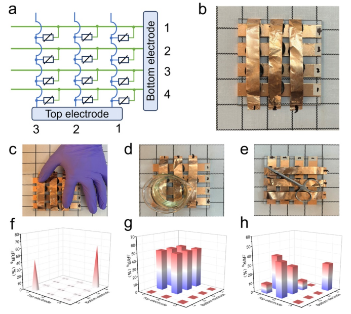 圖7. 傳感器陣列。(a)傳感器陣列示意圖。(b)傳感器陣列照片,傳感器陣列檢測(c) (f)手指,(d) (g)燒杯,(e) (h)剪刀的壓力分布。