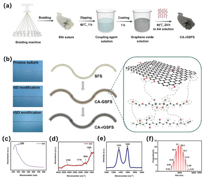Fig 1. CA-rGSFS制備示意圖及GO溶液表征。(a)CA-rGSFS制備過程示意圖;(b)SFS、CA-GSFS、CA-rGSFS照片及CA與GO結(jié)合示意圖;(c)GO溶液的紫外吸收光譜;(d)GO的紅外光譜;(e)GO的拉曼光譜;(f)GO溶液的粒徑。