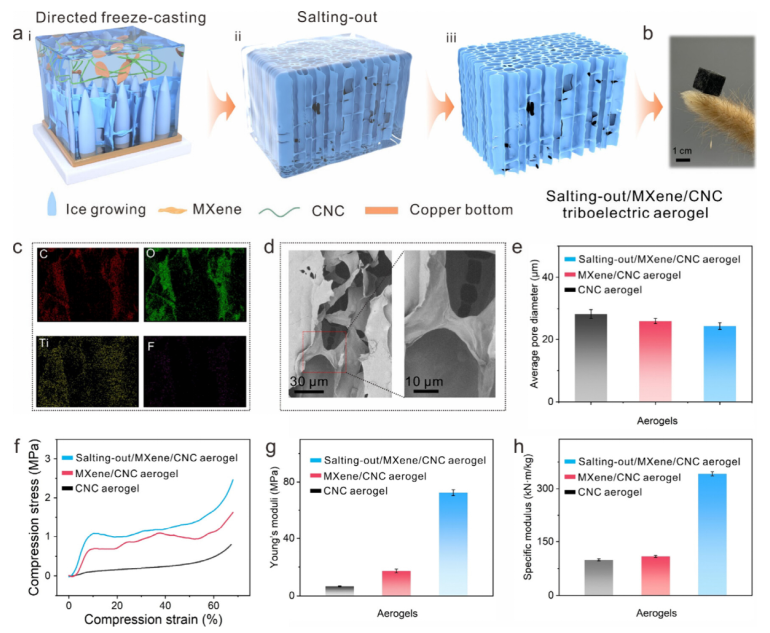 Fig 2. 摩擦電氣凝膠的制備和表征。(a) 摩擦電氣凝膠組裝過程的示意圖。(b) Salting-out/MXene/CNC 摩擦電氣凝膠的輕量特性和(c) EDS 映射圖像。(d) Salting-out/MXene/CNC 摩擦電氣凝膠的 SEM 側(cè)視圖像。(e) 氣凝膠的平均孔徑比較。(f) 氣凝膠的壓縮應(yīng)力-應(yīng)變曲線。(g) 氣凝膠的楊氏模量和(h) 氣凝膠的特定模量。