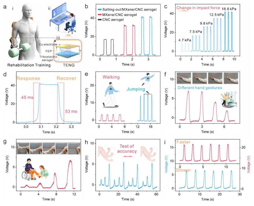 Fig 4. 機(jī)械強(qiáng)度氣凝膠的摩擦電特性及應(yīng)用。(a) 自供電傳感器的組成和應(yīng)用示意圖。(b) 摩擦電特性的比較。(c) 不同壓力下 TENG 的輸出性能。(d) TENG 的響應(yīng)時間。(e) 傳感器在行走或跳躍狀態(tài)下的電壓值。自供電傳感器用于監(jiān)測(f) 不同的手指運(yùn)動和(g) 不同的腿部彎曲角度。(h) 不同角度彎曲手臂的循環(huán)測試。(i) 不同彎曲頻率下循環(huán)測試的電壓值。