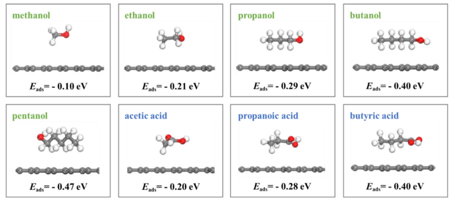 圖9. 石墨烯上的醇酸吸附構(gòu)型(黑色、白色和紅色球分別代表C、H和O原子)。