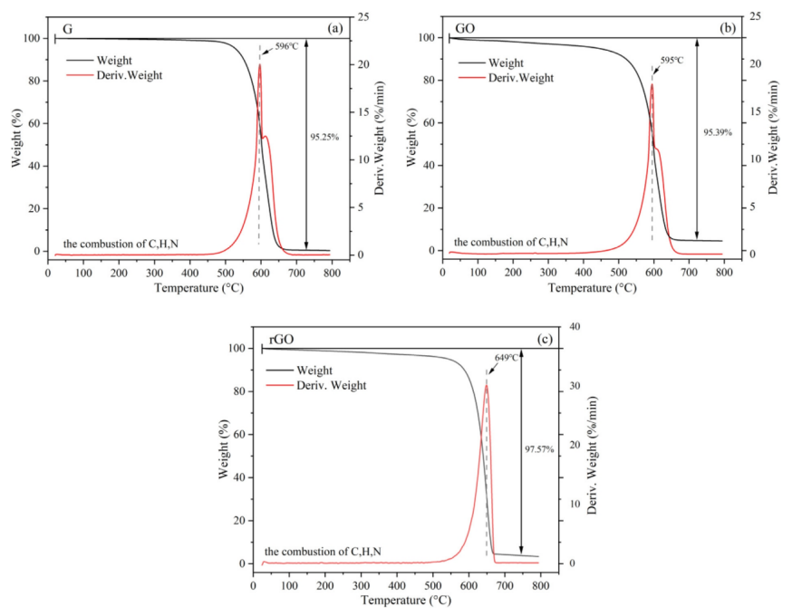 圖3. (a) G,(b) GO,(c) rGO氣流下的TG/DTG曲線。