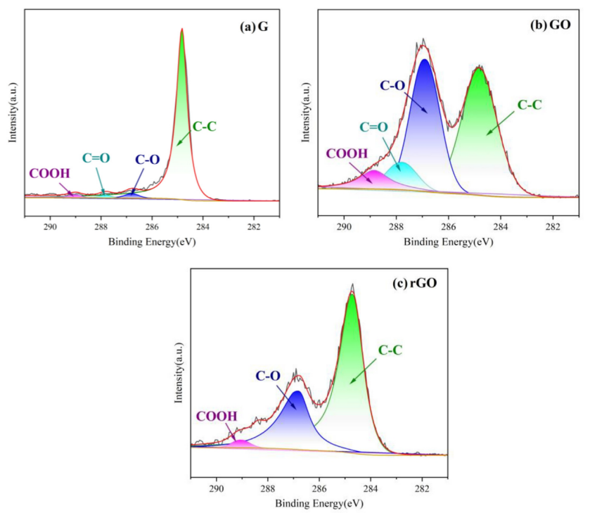 圖5. (a) G,(b) GO,(c) rGO 的C1s XPS光譜。