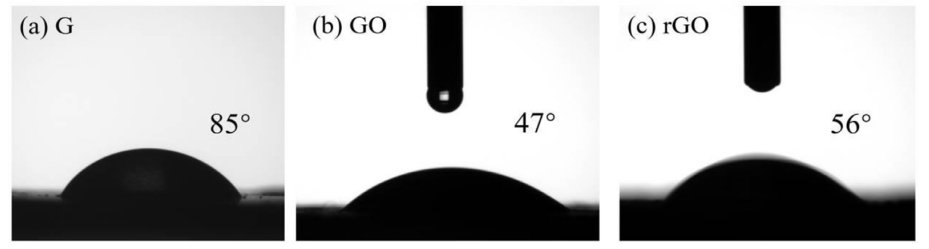 圖6. G (a)、GO (b)和rGO (c)的水接觸角。