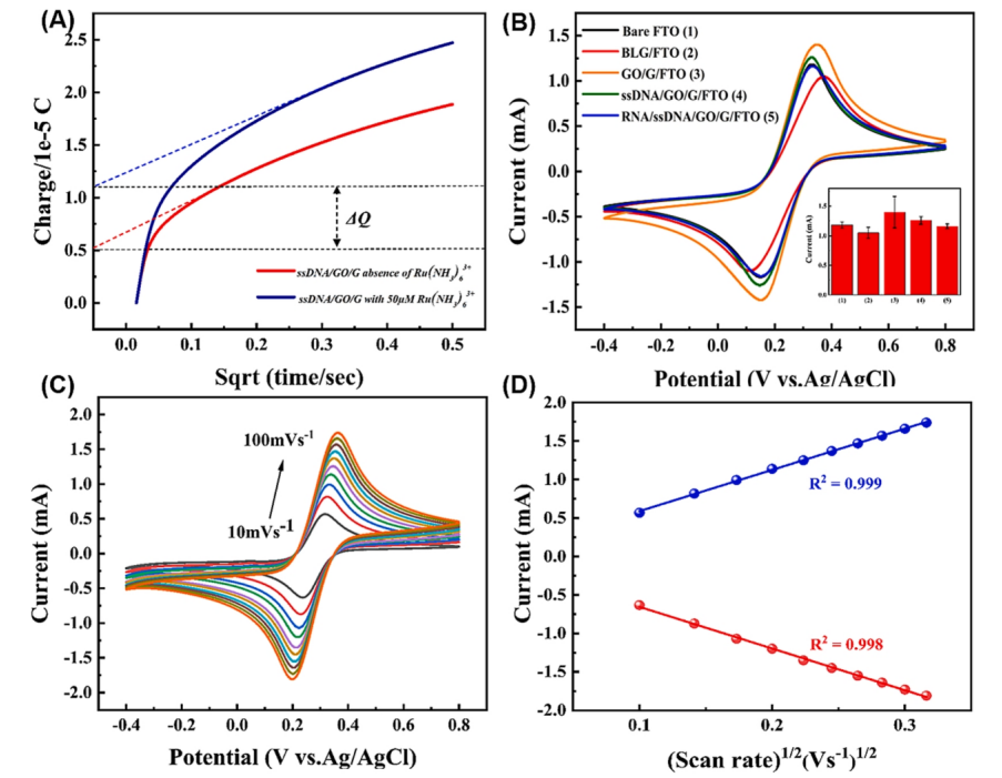 -1的不同掃描速率下的GO/G/FTO的CV曲線,(D)平方根掃描速率與峰電流之間的相應(yīng)相關(guān)性。