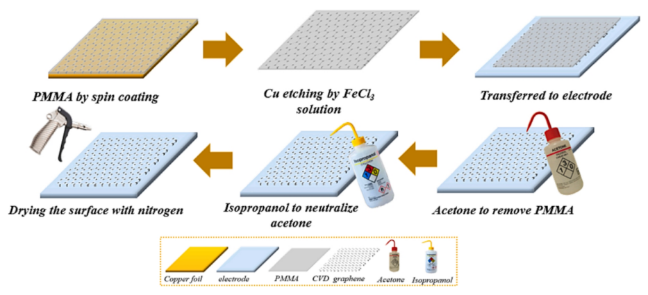 流程圖1. 使用簡(jiǎn)易濕法轉(zhuǎn)移工藝將BLG從銅箔轉(zhuǎn)移到FTO基板的示意圖。