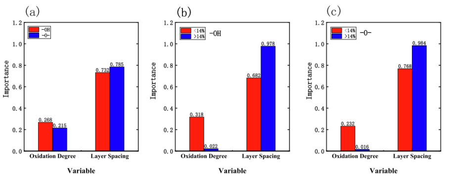 圖5. GO膜結(jié)構(gòu)特性對水?dāng)U散性能的重要性分析。(a)–OH和–O氧化范圍的完整程度比較;氧化度低于和高于(b)-OH和(c)-O-對比的14%。