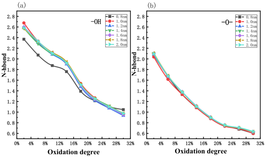 圖7. 對于不同的層間距離,氧化基團(tuán)在不同的氧化程度下與水形成的氫鍵的平均數(shù):(a)-OH (b)-O-。