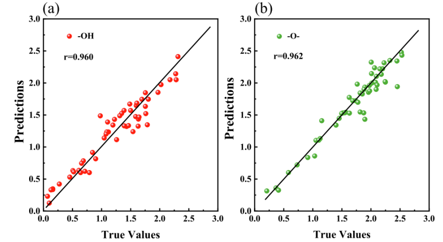 圖4. 當(dāng)GO被(a)羥基(-OH)和(b)環(huán)氧基(-O-)修飾時(shí),MD(水平)計(jì)算值和XGBoost(垂直)預(yù)測值之間的水?dāng)U散系數(shù)相關(guān)圖。