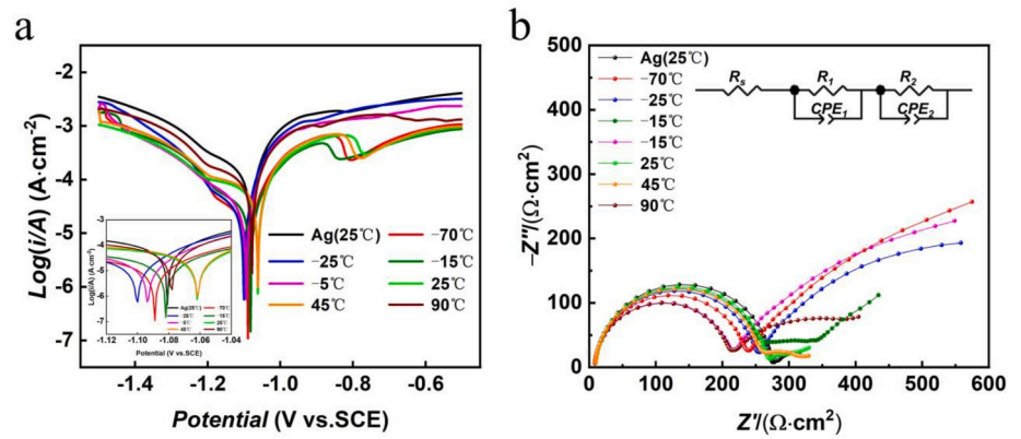圖7. (a)純Ag和Ag-G復(fù)合鍍層在不同硫化溫度下168 h后的Tafel極化曲線和(b)電化學(xué)阻抗譜曲線。