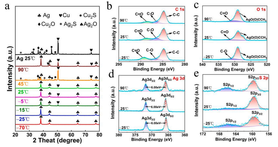圖3. (a)在不同硫化溫度下168小時后,純Ag涂層和Ag-G復(fù)合涂層的XRD圖。(b)在硫化溫度為-25°C、25°C和90°C下168小時,Ag-G復(fù)合涂層的C 1s、(c) O 1s、(d) Ag 3d、(e) S 2p XPS光譜