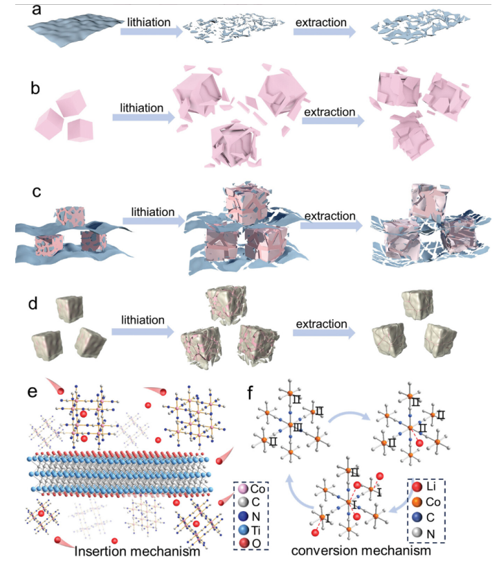 圖 5. a) MXene、b) Co-PBA、c) Co/M(5:2)夾層結構、d) Co@M(5:2)核殼結構在循環(huán)過程中鋰離子插入和脫出過程中結構變化示意圖。e,f) Co@M(5:2)結構的儲鋰機制示意圖。