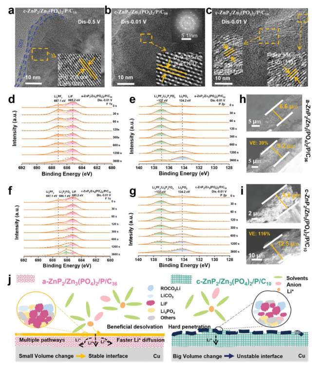 6)組裝后不同刻蝕時(shí)間的P 2p XPS光譜DEC(體積比:1/1),含10%(體積分?jǐn)?shù))的FEC和1%(體積分?jǐn)?shù))的VC添加劑)。h、 i)在電流密度為10 a g−1的1000次循環(huán)后,(h)a-ZnP