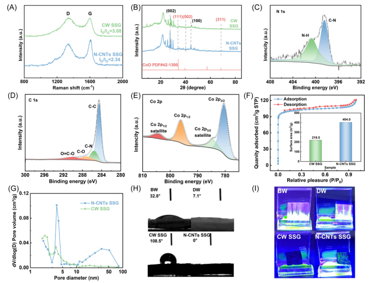 Fig 3. 腸絨毛狀N-CNTs SSG和CW SSG的化學成分、多孔結(jié)構(gòu)和親水性表征:(a) N-CNTs SSG和CW SSG的拉曼光譜;(b) XRD表征;(c-e) N 1s, C 1s, Co 2p元素的高分辨率XPS光譜;(f) N-CNTs SSG的N2吸附-解吸等溫線及比表面積;(g) N-CNTs SSG和CW SSG的孔徑分布;(h) BW、DW、CW和N-CNTs SSG的潤濕性能;(i) 以熒光素鈉作為指示劑的水分遷移測試。