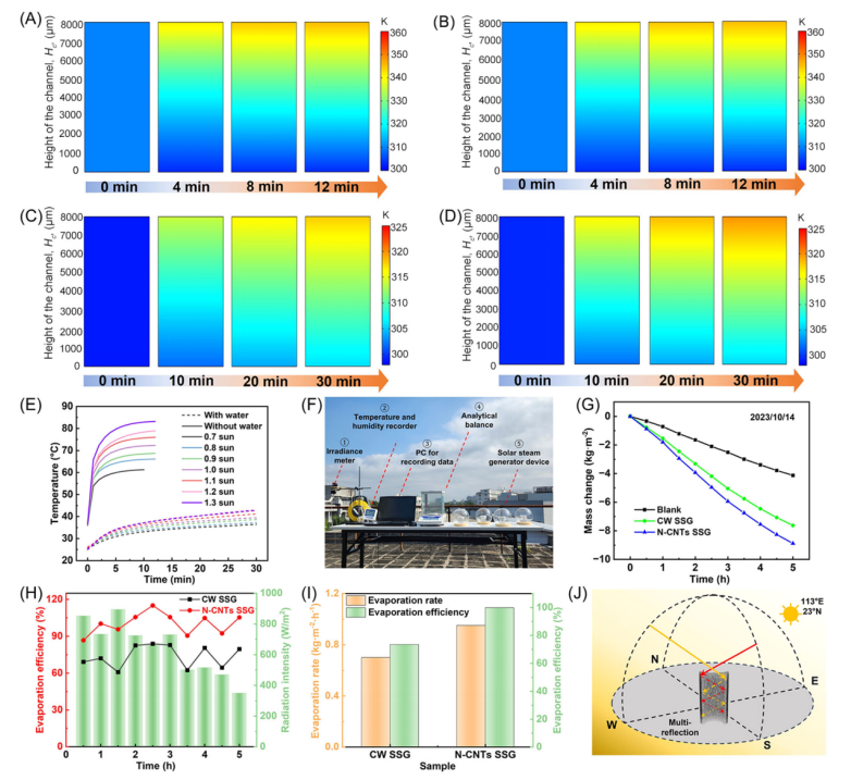 Fig 6. N-CNTs SSG和CW SSG的蒸發(fā)過程中的傳熱傳質(zhì)分析和室外實驗。(a-d) CW SSG 和N-CNTs SSG在全域內(nèi)無水(a, b)和有水(c, d)工況的溫度變化;(e) N-CNTs SSG 的頂面溫度變化;(f) 戶外太陽能界面蒸發(fā)實驗示意圖;(g) N-CNTs SSG、CW SSG和純水的質(zhì)量變化;(h) 和 (i) N-CNTs SSG和CW SSG的蒸發(fā)速率和蒸發(fā)效率;(j) N-CNTs SSG對太陽光全天候利用示意圖。