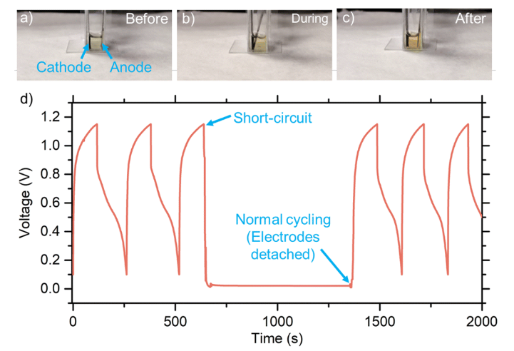 Fig 6. 測試設(shè)置,電解質(zhì)中有一個(gè)陰極和一個(gè)陽極(約 590 μL),具有三種不同的電極配置(a)短路前,(b)短路中,以及(c)短路后,以及(d)相應(yīng)的電壓隨時(shí)間變化的曲線。