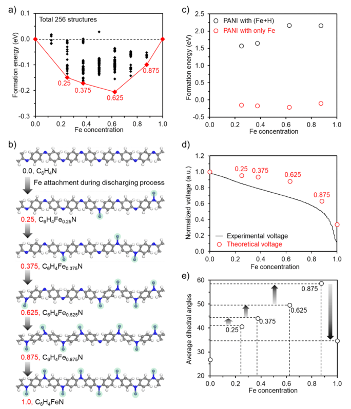 x N,x = 0.25, 0.375, 0.625, 0.875 和 1.0)。(c) 兩種不同 PANI 結(jié)構(gòu)的形成能,其中氮位點(diǎn)僅被 Fe 或 Fe + H(混合 Fe 和 H)占據(jù)。(d) 當(dāng) PANI 中 Fe 濃度為 0.25、0.375、0.625、0.875 和 1.0 時(shí)的理論電壓曲線,以及 5C 時(shí)的實(shí)驗(yàn)電壓曲線。(e) 對應(yīng)于 Fe 濃度的 PANI 結(jié)構(gòu)的平均二面角。