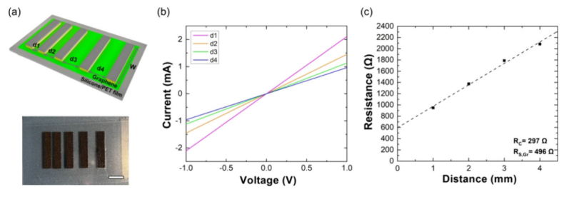 Fig 2. 圖案化后銅接觸的電學(xué)特性。(a) 用于確定接觸電阻和薄層電阻、具有不同間距的測試圖案示意圖(上圖)與光學(xué)圖像(下圖)。在硅酮/聚對苯二甲酸乙二酯(PET)薄膜上通過化學(xué)氣相沉積生長的石墨烯,與生長后圖案化的銅電極在不同距離下進行電接觸。比例尺:1厘米。 (b) 電流 - 電壓特性。(c) 電阻與距離的關(guān)系。